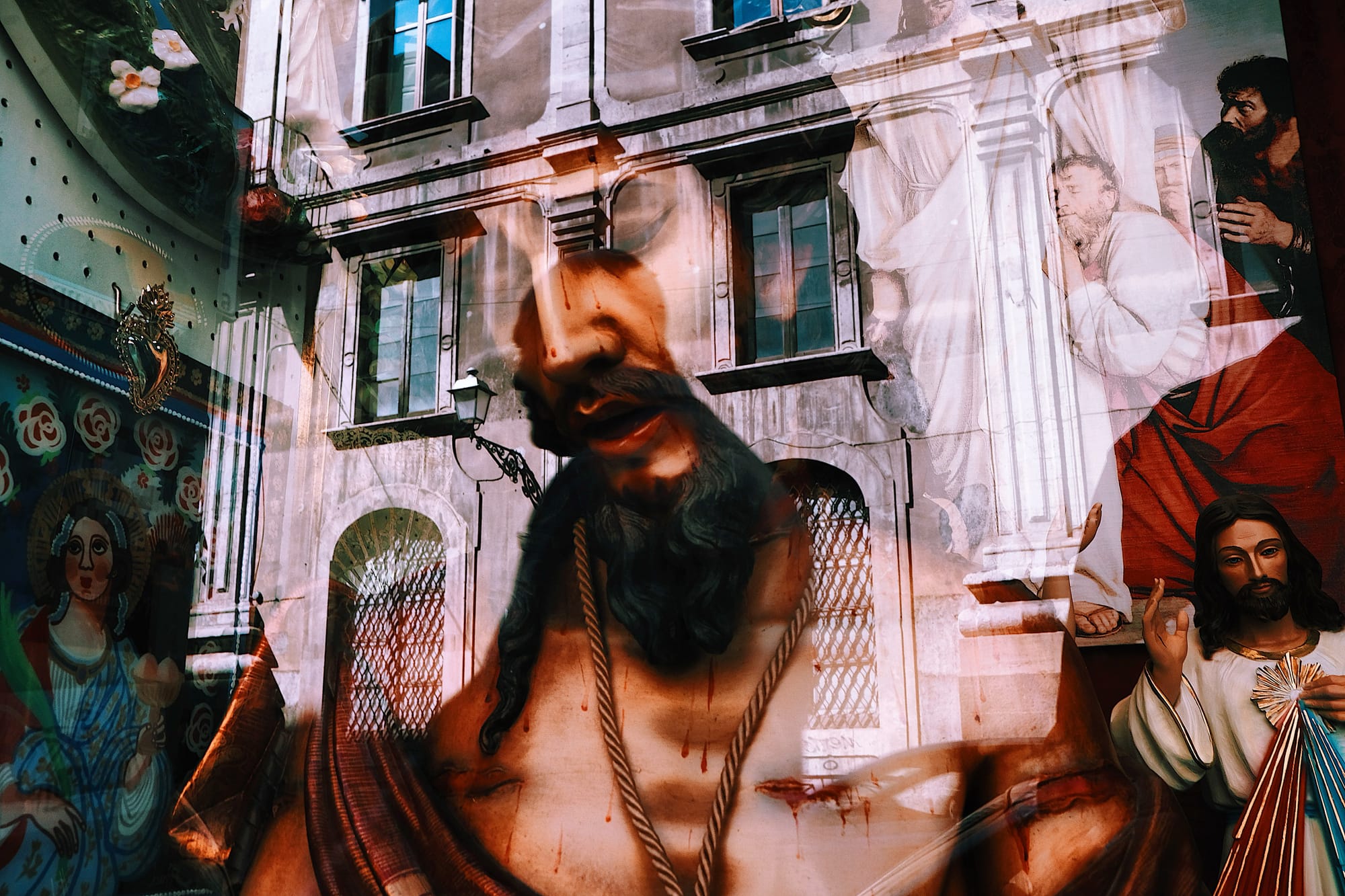 Mi hai parlato prima di equilibrio, di un sacro e profano che si interpongono in strada, senza mai interrompersi a vicenda. Io ci vedo, anche grazie a quelli che sono i colori e le atmosfere delle tue fotografie, una sorta di purgatorio in terra, un luogo di confine, appunto, dove il destino delle anime è in attesa di giudizio, dove bastano pochi passi falsi per elevarsi al divino o scendere definitivamente nell'empio. Proveremo le stesse sensazioni guardando la mostra esposta a Piazza Scammacca?