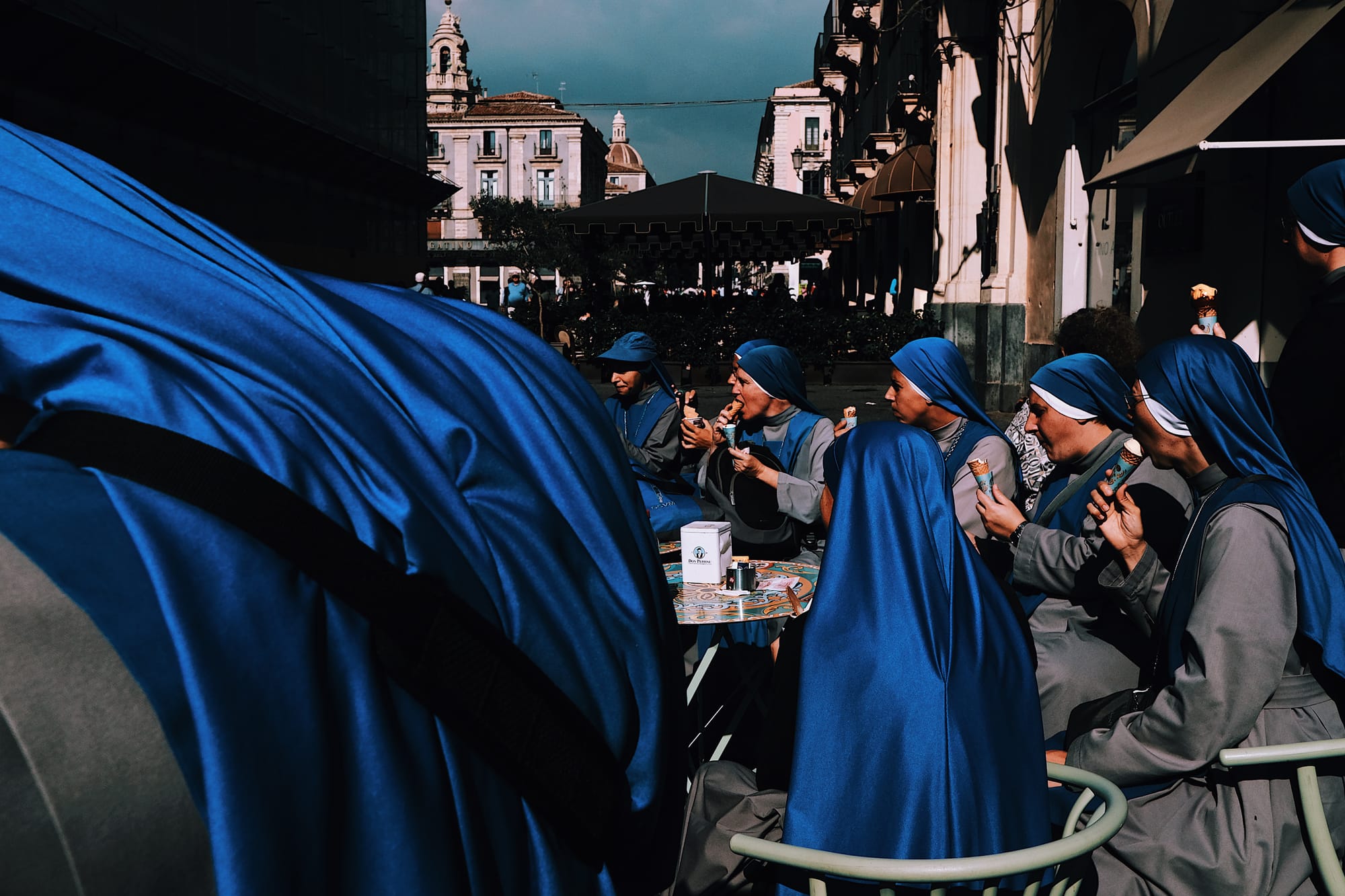 Nella narrazione di cosa sia sacro e profano, hai scelto di rendere evidenti due percorsi prestabiliti: il sacro è la religione; il profano la strada e la sua gente. Detta così sembrerebbe essere una dualità già vista altrove, tuttavia il binomio non si esaurisce qui. Nel tuo progetto esistono infatti dei punti di contatto - come la fotografia delle suore che mangiano il gelato o il palloncino di Spiderman durante la festa di Sant'Agata - che contribuiscono ad aumentare l'ambiguità di questo «labilissimo confine». Il valore di quelle immagini, mi pare di capire, è cruciale nella riconoscibilità del tuo lavoro